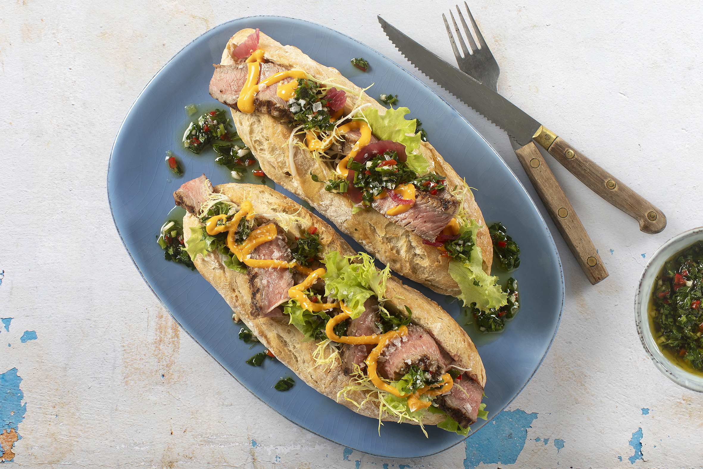 NB: Billedet viser et eksempel på en pepito steak sandwich med grillet Black Angus steak, sprød salat og chimichurri.